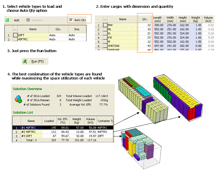 CubeMaster Features TourMix LoadThe Mix Load finds the minimum number of vehicles needed to load different cargo types when you know dimension and order quantities of each cargo type. Two cases of the mix load are possible; the first is when you know the number of each vehicle types already and the second is you do not know. Of course you can calculate both of them. Moreover you can assign the priority of each vehicle type at the first case. Here is a sample for the first case;